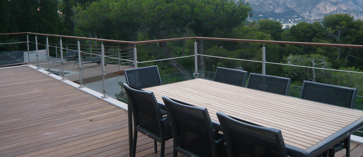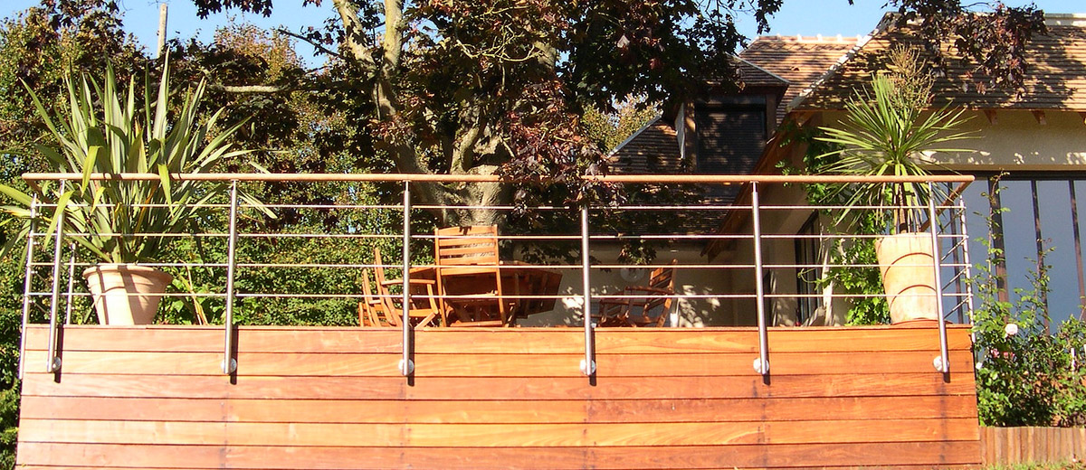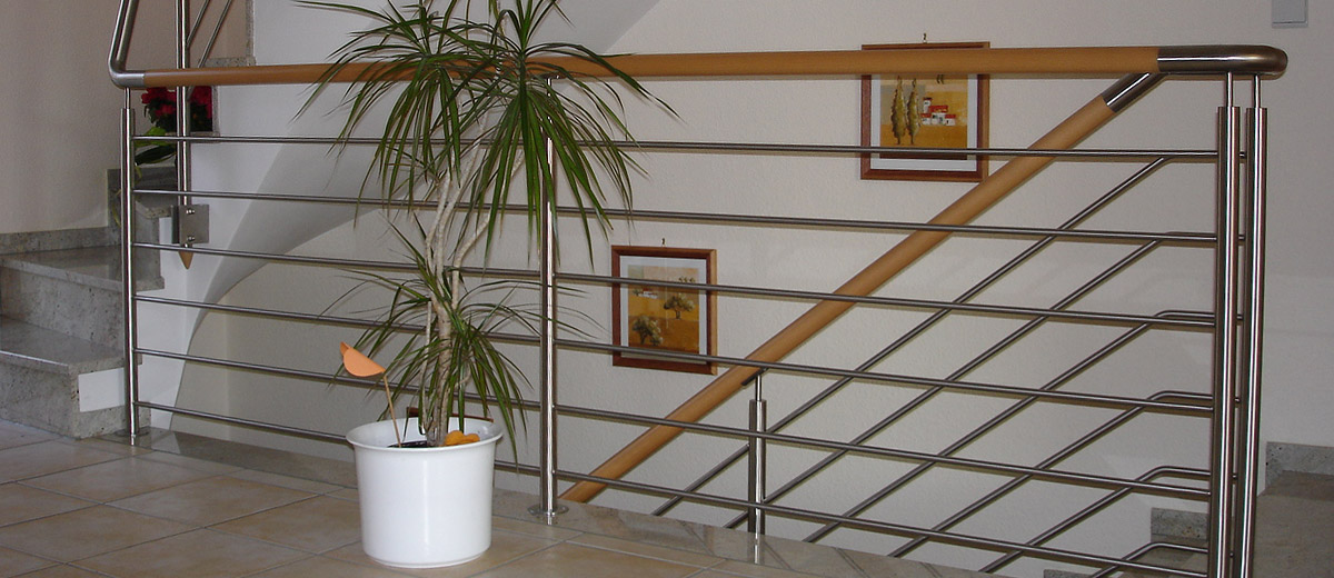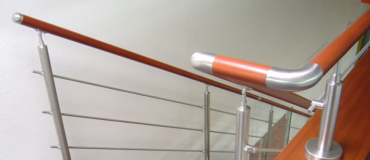 Ein Geländer aus Edelstahl und Holz ist an einem Balkon angebracht.